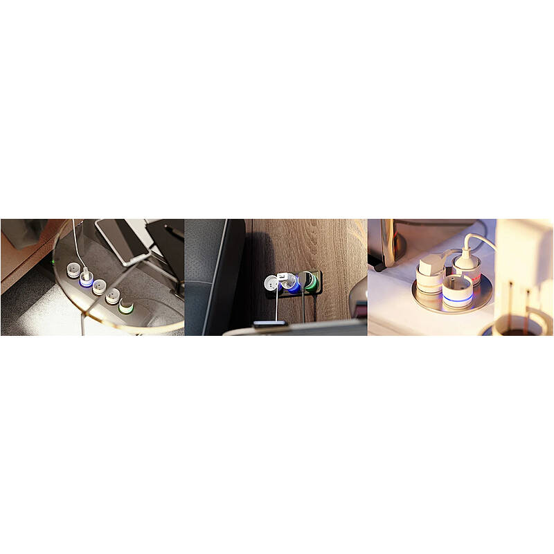 - LED-Anzeige – LED-Ring, der über die Stromaufnahme durch das angeschlossene Gerät, die Überlastung oder Überhitzung informiert